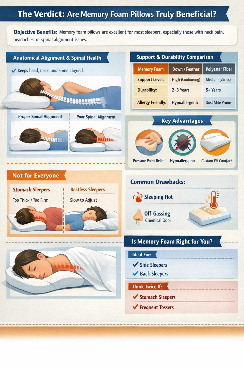Хотя они предлагают значительные ортопедические преимущества, они не являются универсальной панацеей. Их «качественность» во многом зависит от вашей личной позы во время сна, жароустойчивости и чувствительности к запахам материалов. Для сна на боку или на спине подушка из пены с эффектом памяти может быть подходящим вариантом. преобразующий инструмент для гигиены сна , тогда как человеку, спящему на животе, они могут показаться слишком строгими или жесткими.