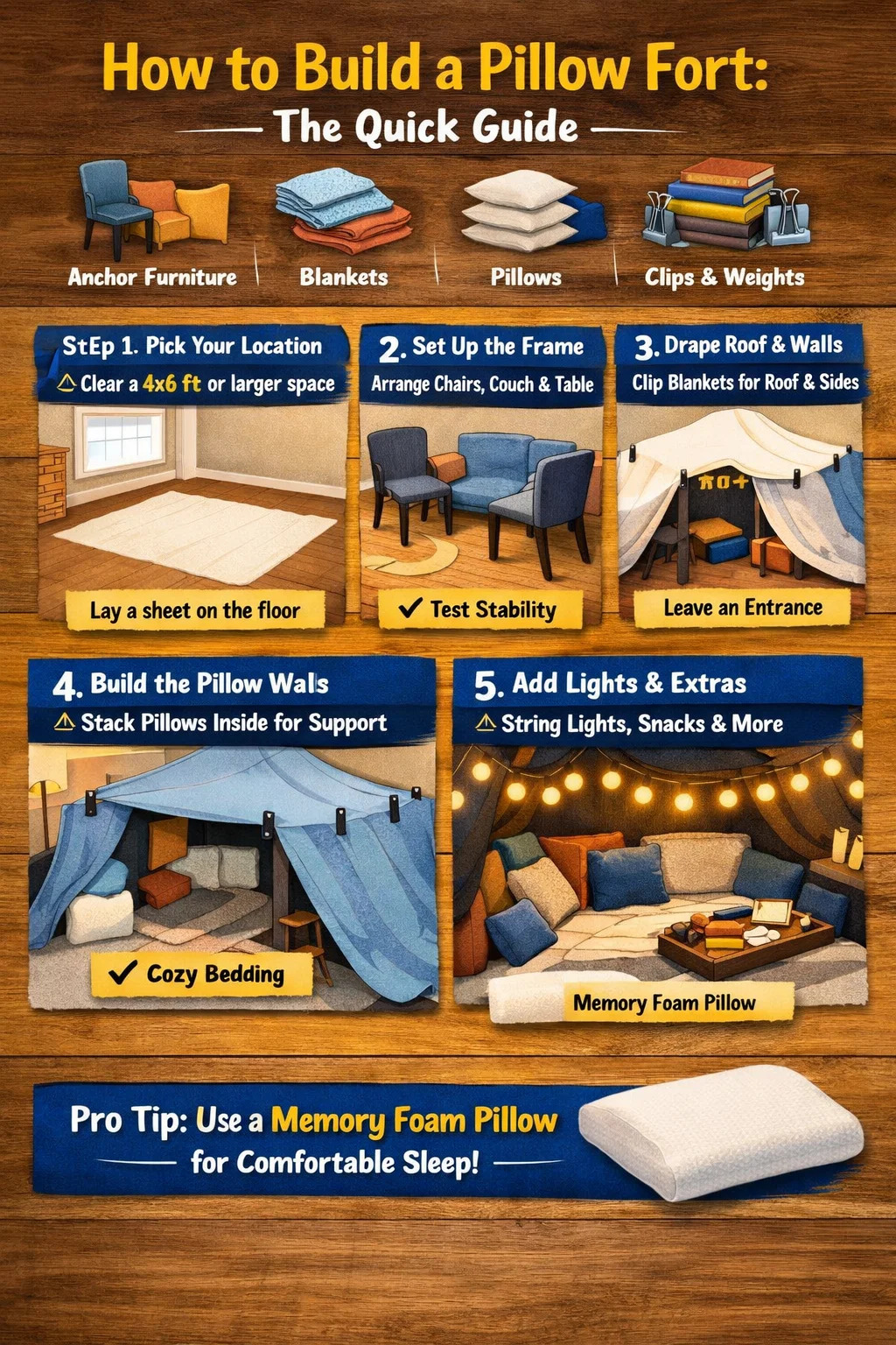 Создание крепости из подушек сводится к четырем основным этапам: выберите прочную базовую конструкцию (например, диван или стулья), накройте сверху одеялами, чтобы сформировать стены и крышу, сложите подушки по краям и внутри для поддержки и изоляции, затем закрепите все зажимами или тяжелыми предметами. Хорошо построенный форт может сохранять свою форму часами, а с правильными подушками внутри он становится по-настоящему удобным, а не просто детской новинкой.