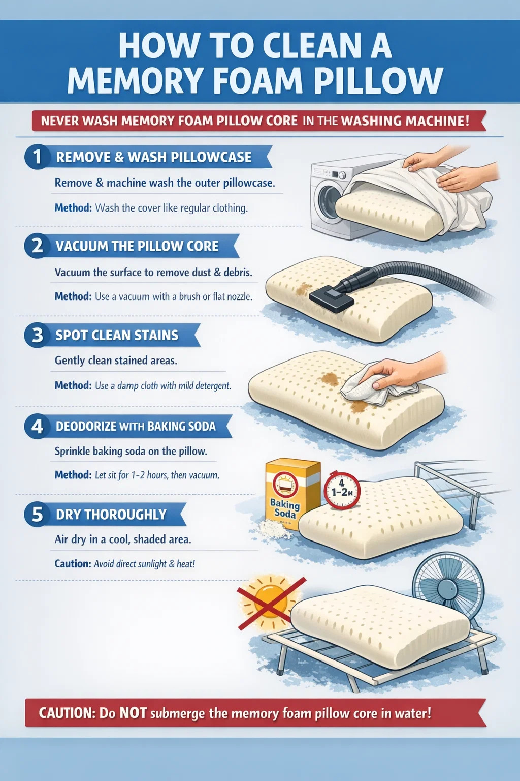 Хотя «сердцевину подушки» нельзя стирать в машине, вы можете безопасно очистить подушку из пены с эффектом памяти, выполнив следующие действия: