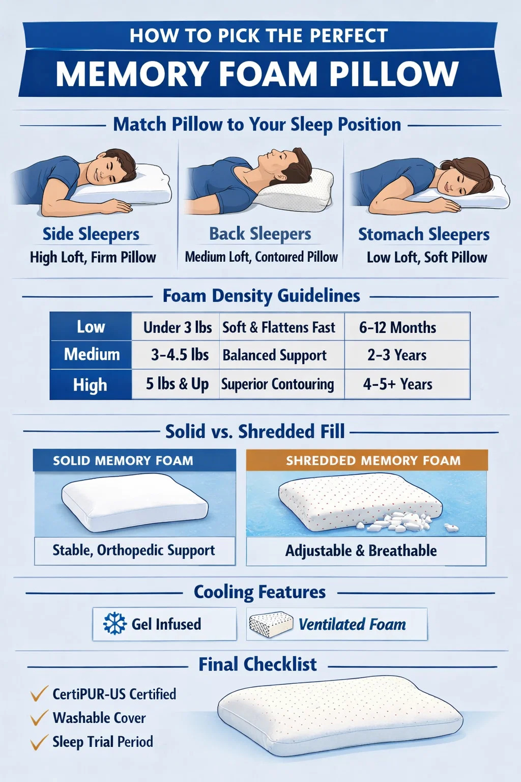 Чтобы выбрать правильный подушка из пены с эффектом памяти , вы должны подобрать «чердак» (высоту) и «жесткость» подушки в соответствии с вашим основным положением для сна. Тем, кто спит на боку, следует выбрать твердую подушку с высоким чердаком, чтобы заполнить пространство между плечами; тем, кто спит на спине, нужна подушка средней высоты с контуром шеи; а для шпал на животе требуется очень тонкий мягкий пенопласт или измельченный наполнитель. За положением всегда проверяйте плотность пены (стремитесь к 3,5 фунтам/фут³ или выше), чтобы обеспечить долговечность и поддержку.