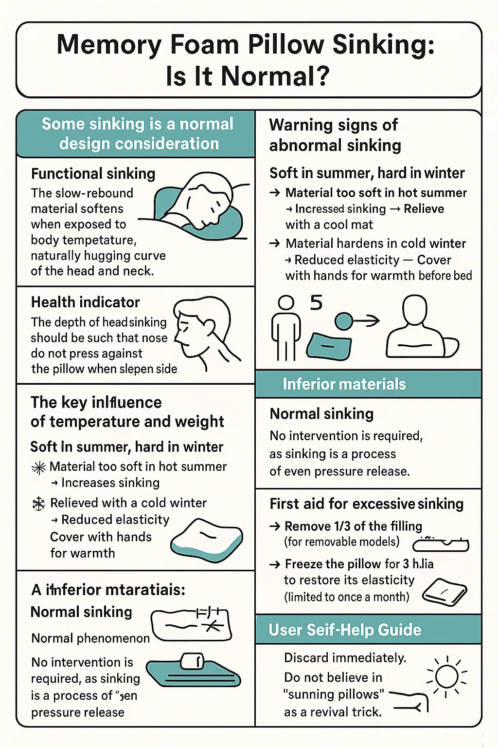 Первая помощь для чрезмерного погружения: → Снимите 1/3 начинки (для съемных моделей) → Поместите сложенное полотенце под наволочку для временной поддержки → заморозить подушку в течение трех часов, чтобы восстановить его эластичность (ограничивается раз в месяц).